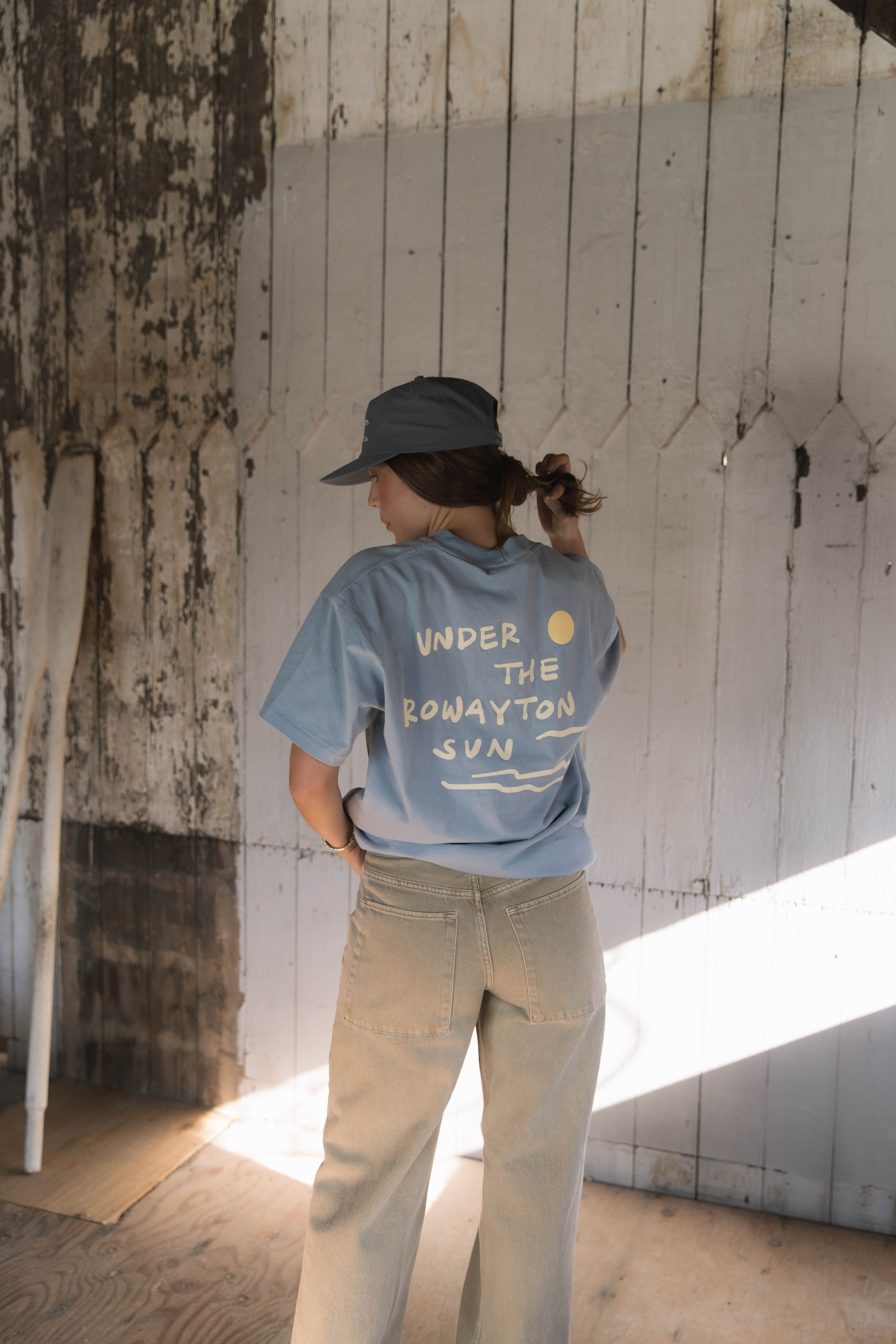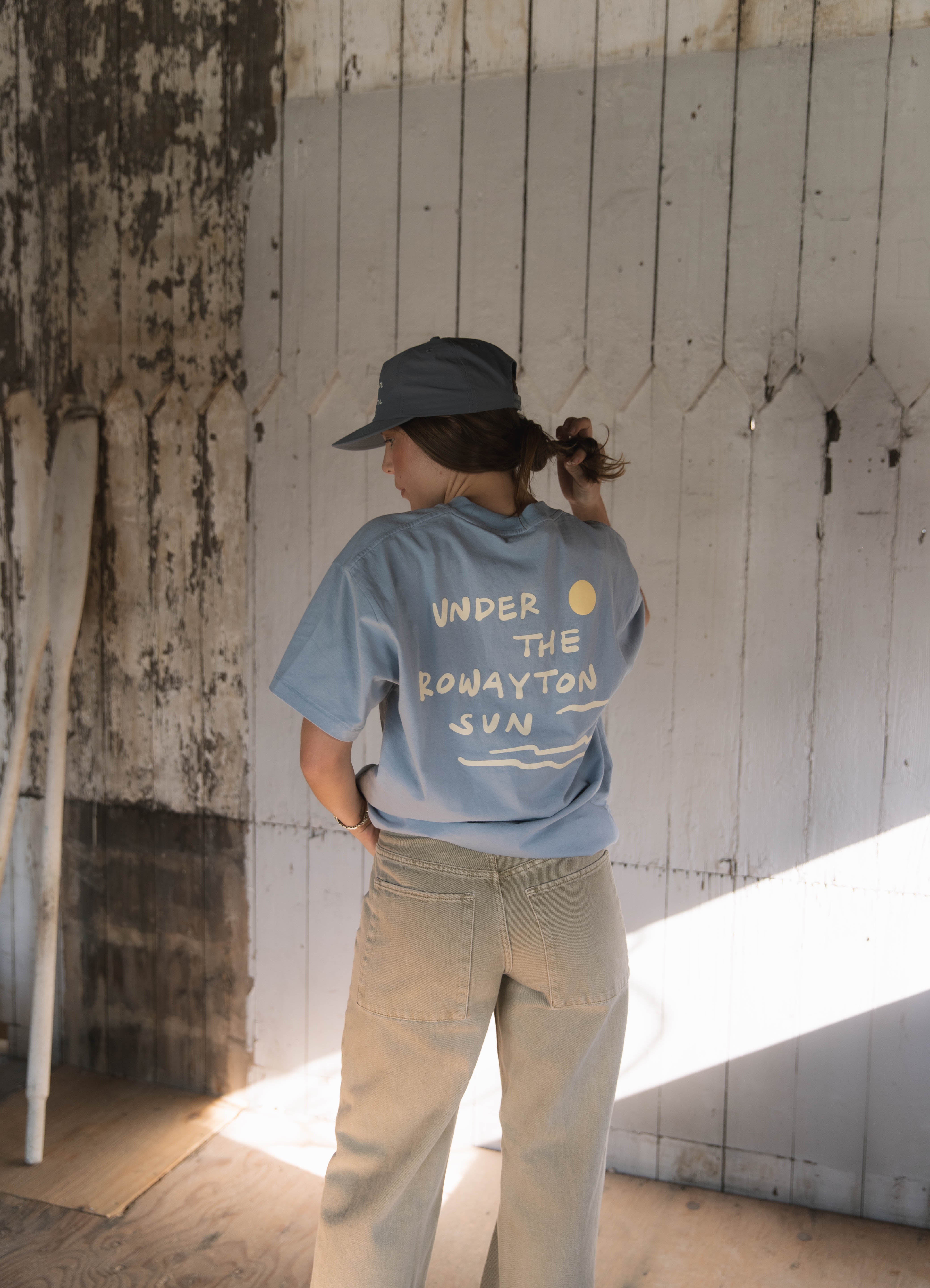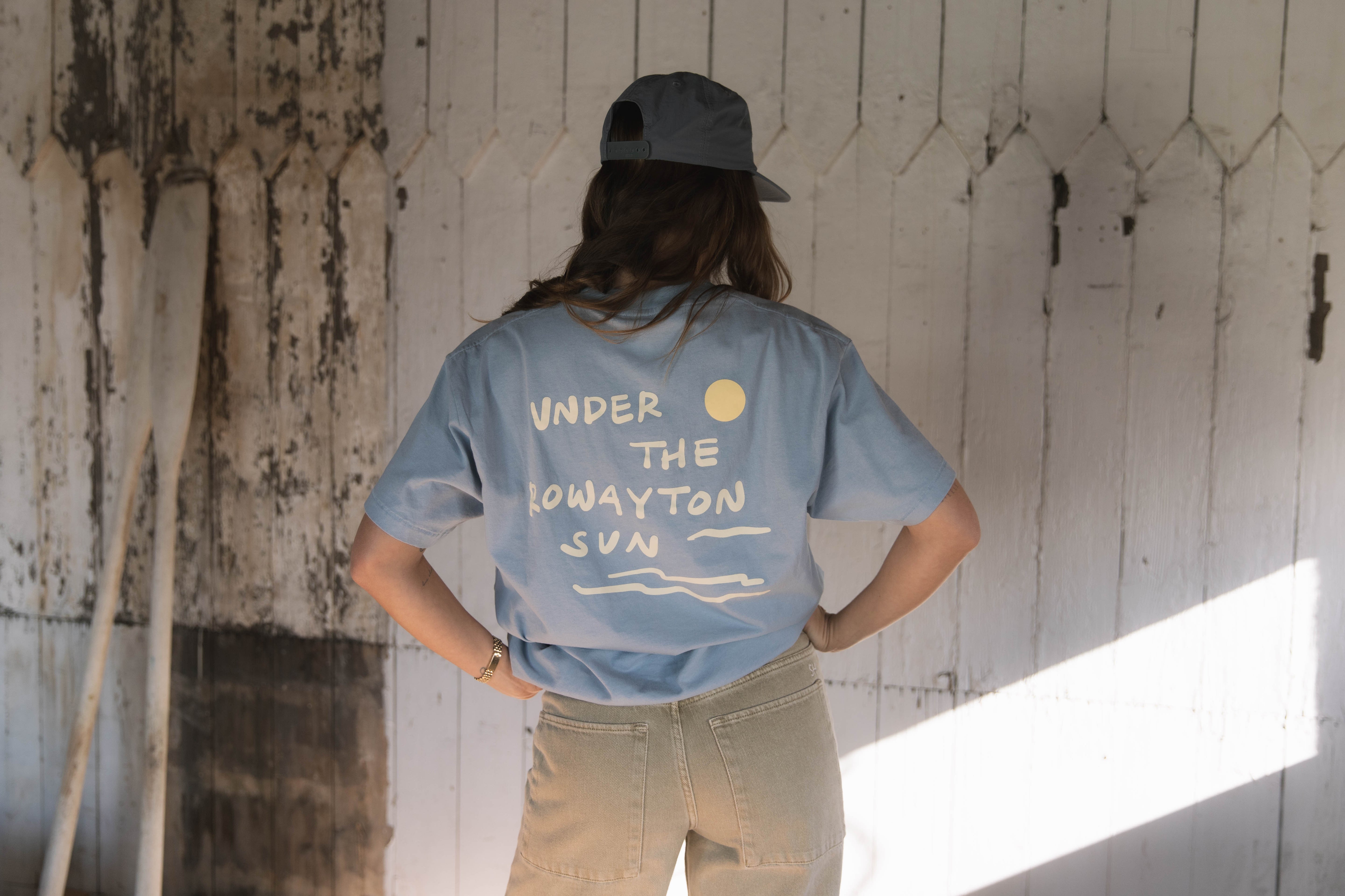 Soft, breezy, and made for days by the water. Our Under the Rowayton Sun tee in baby blue captures the easy, coastal spirit of Rowayton with a clean front and a bold back graphic that brings the sunshine with you. Crafted from ultra-soft cotton with a relaxed unisex fit, it’s the kind of everyday tee you’ll reach for all season long