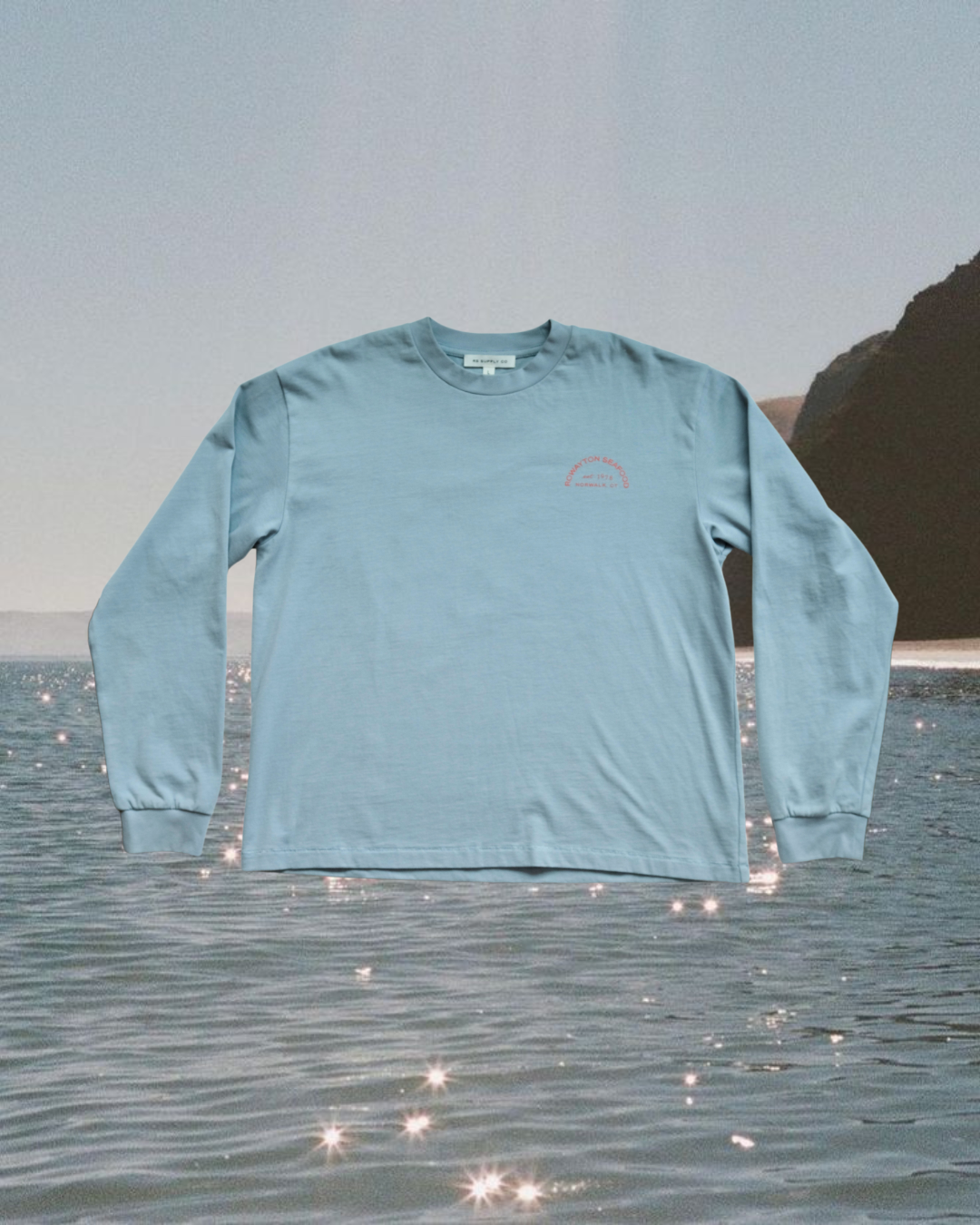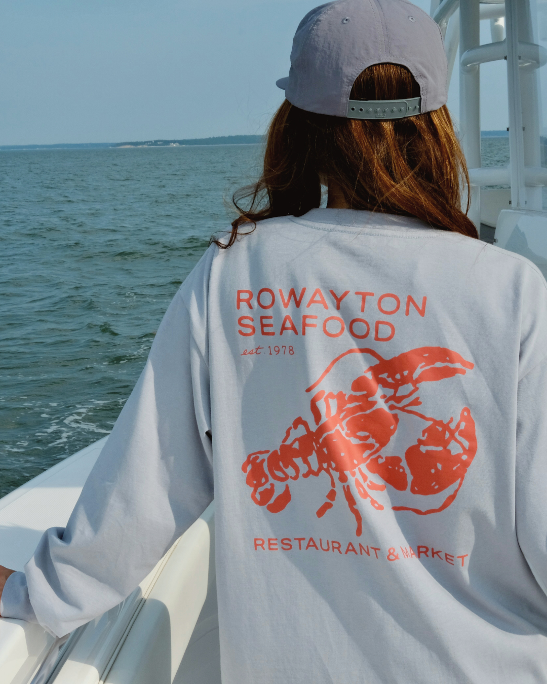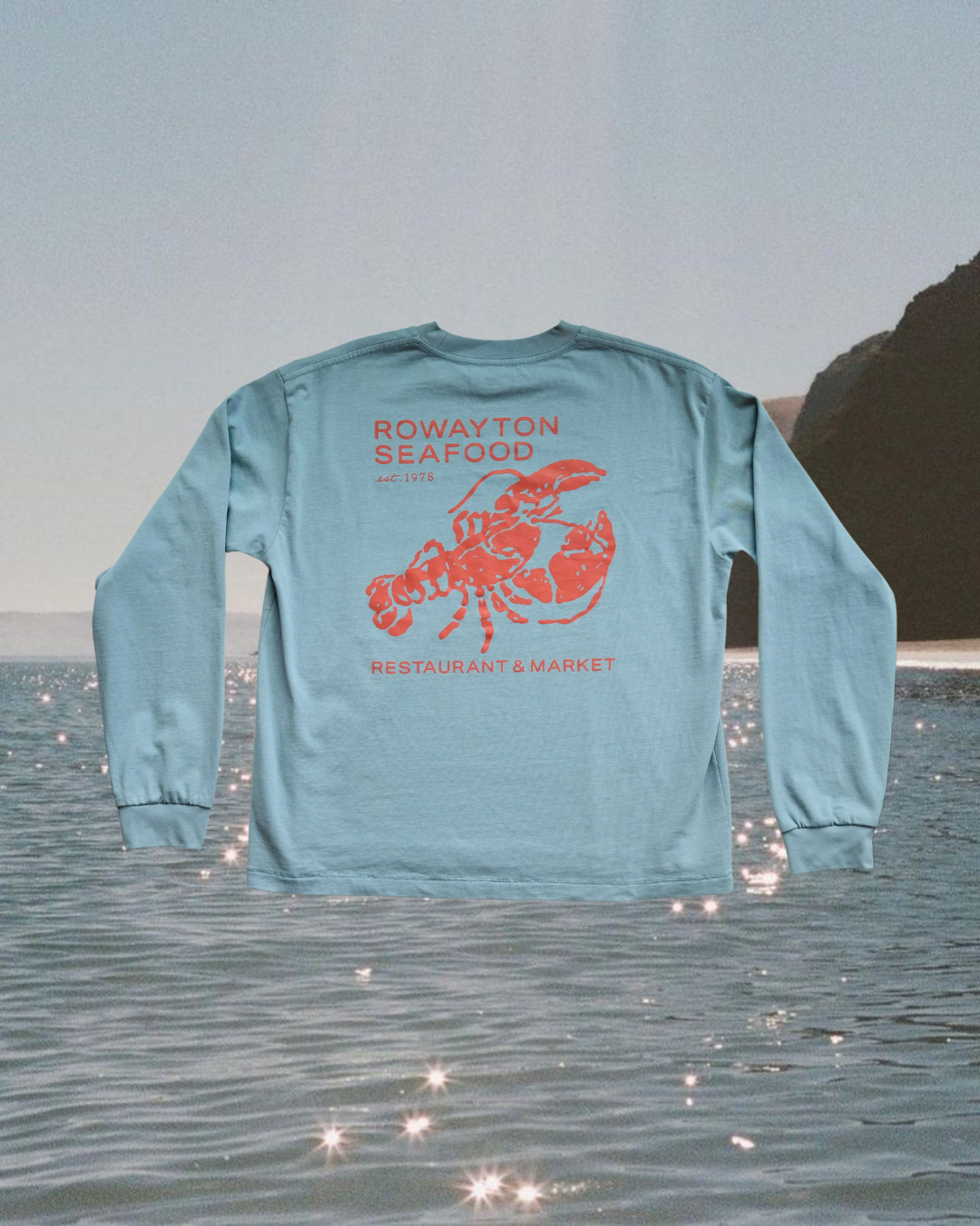 A classic with some claw. This soft blue long sleeve features “Rowayton Seafood” in bold lobster red on the chest, and a full-back graphic of a bright red lobster with “Rowayton Seafood Restaurant & Market” wrapped around it. Cozy, coastal, and a little crustacean flair—ready for breezy days by the water or cracking into a summer boil.