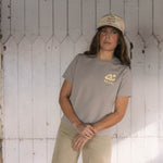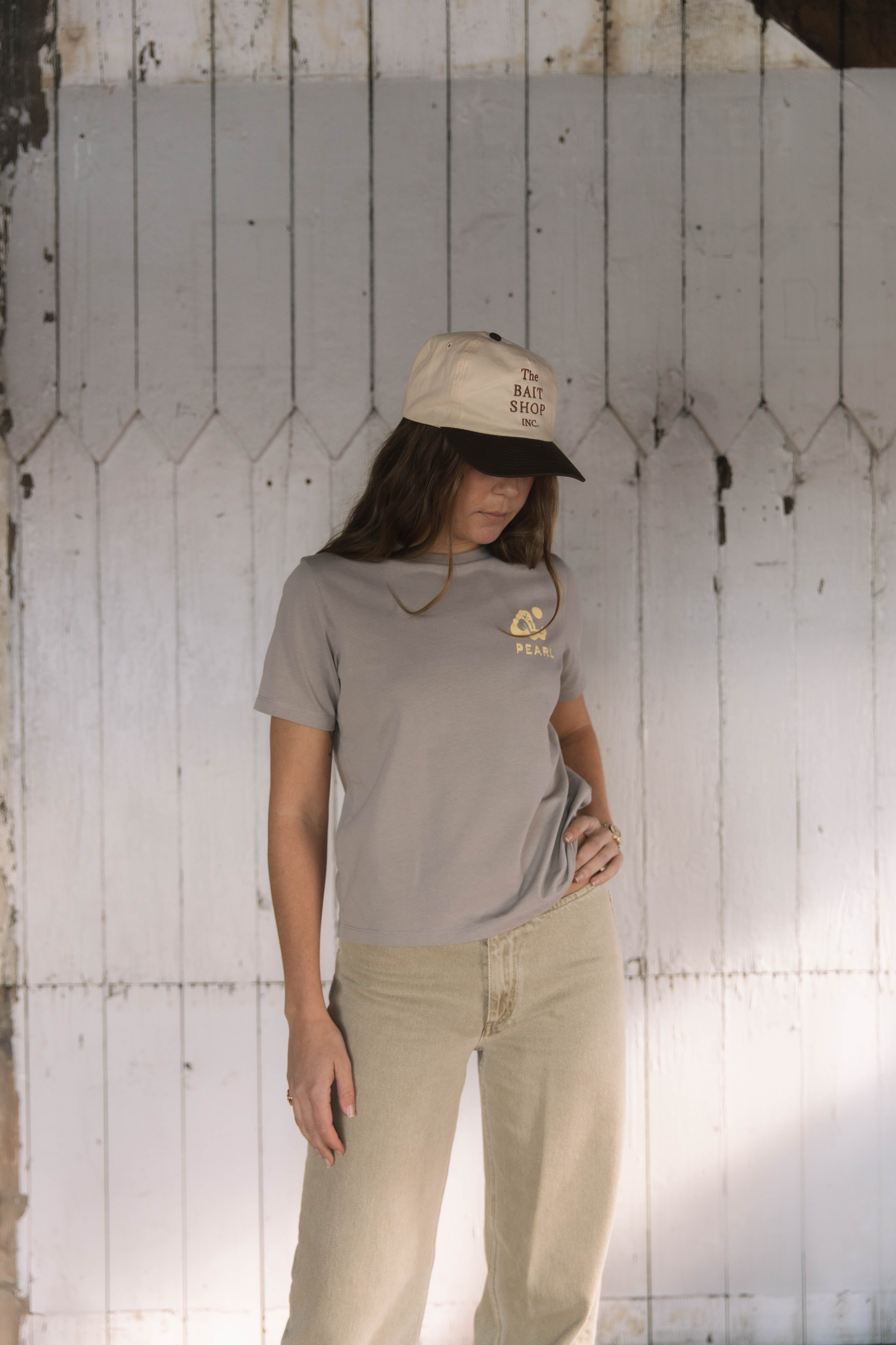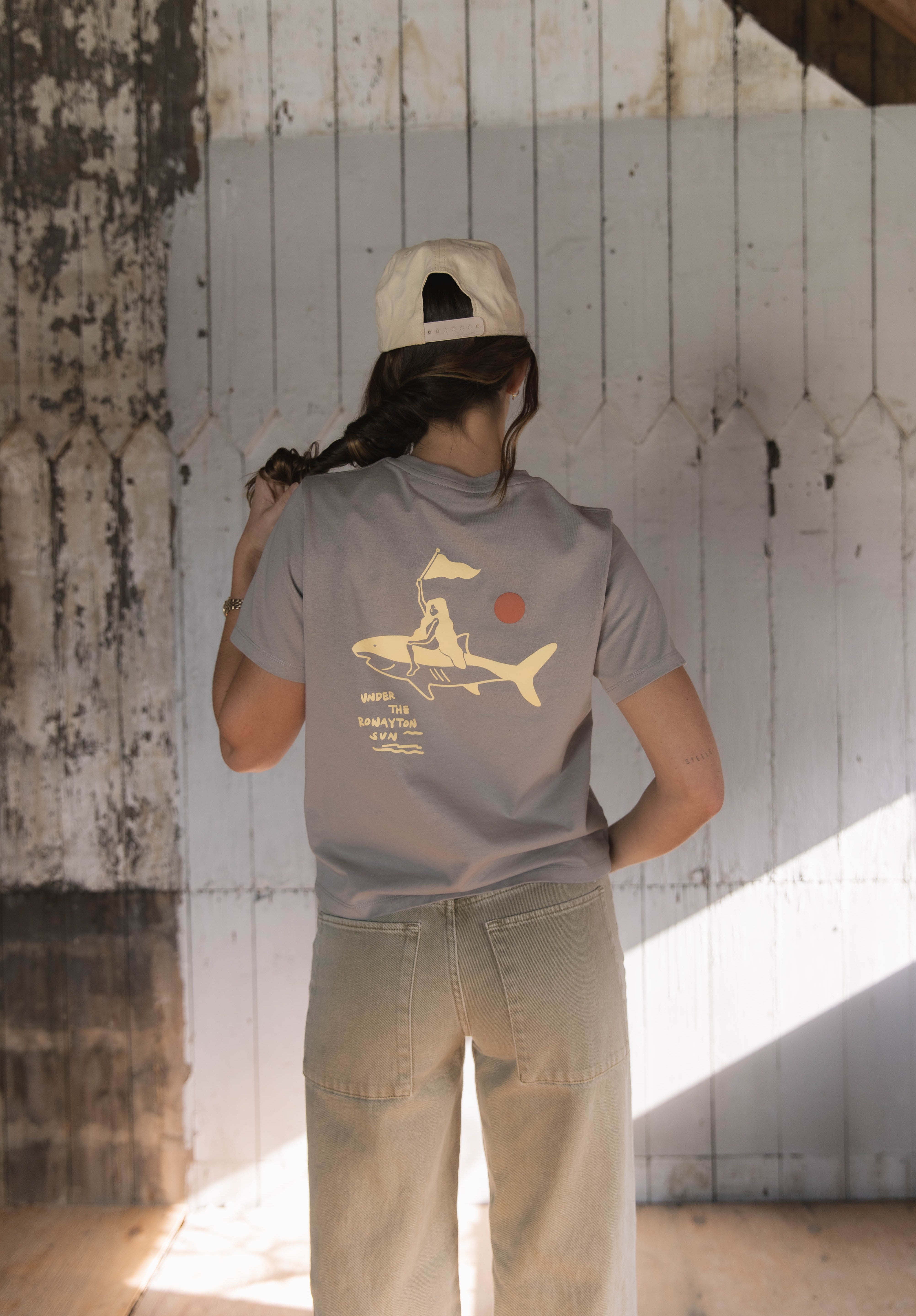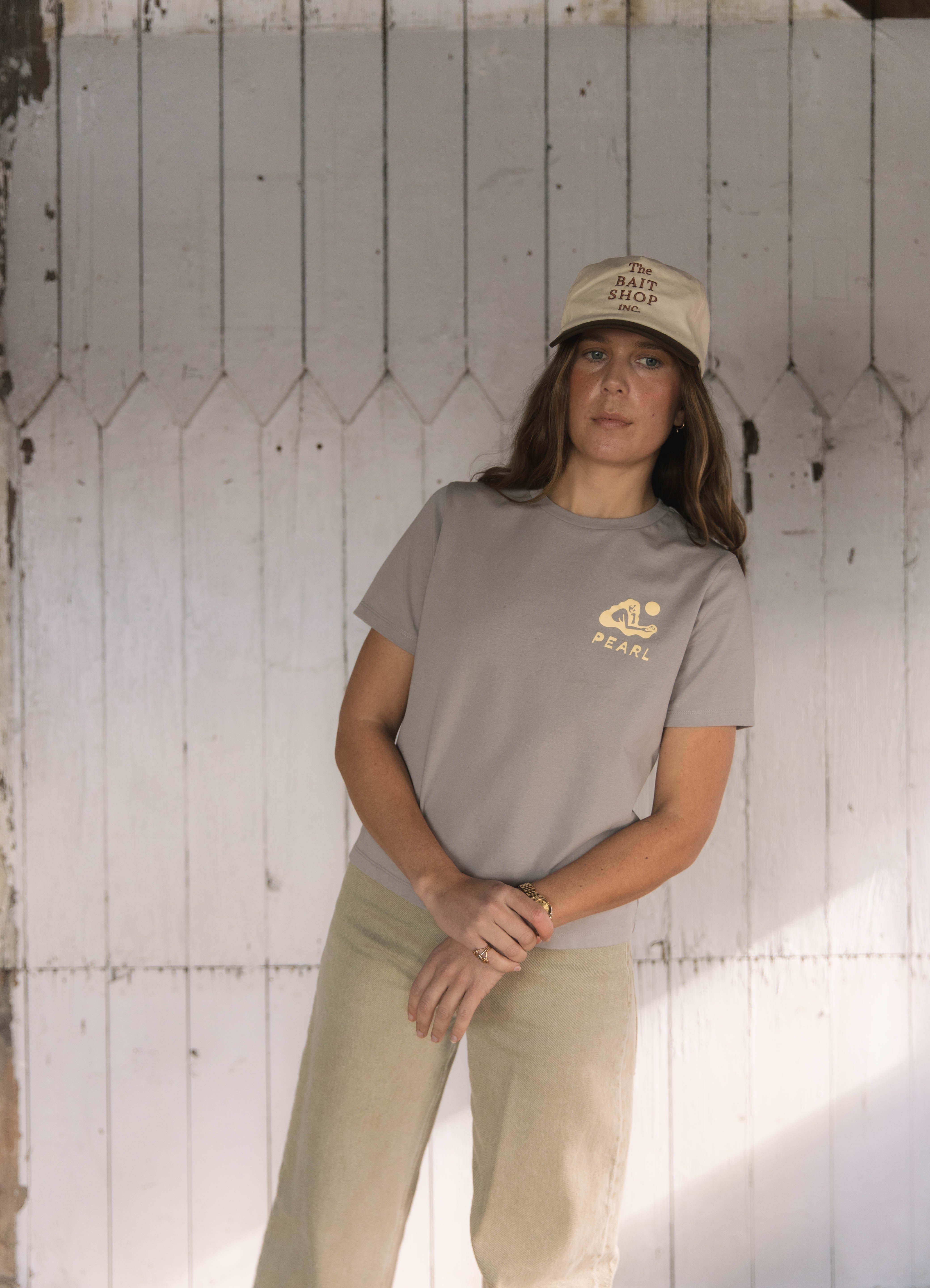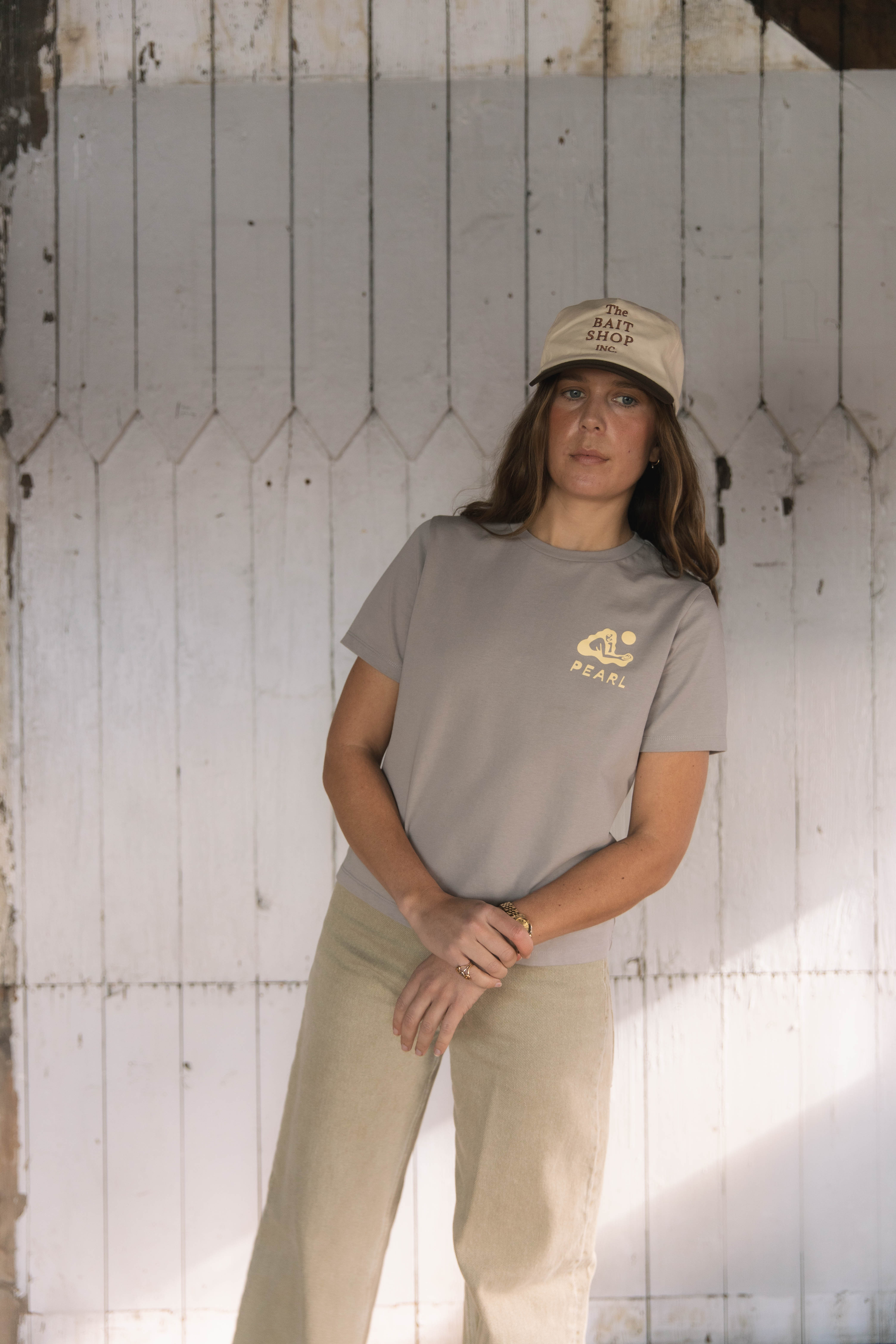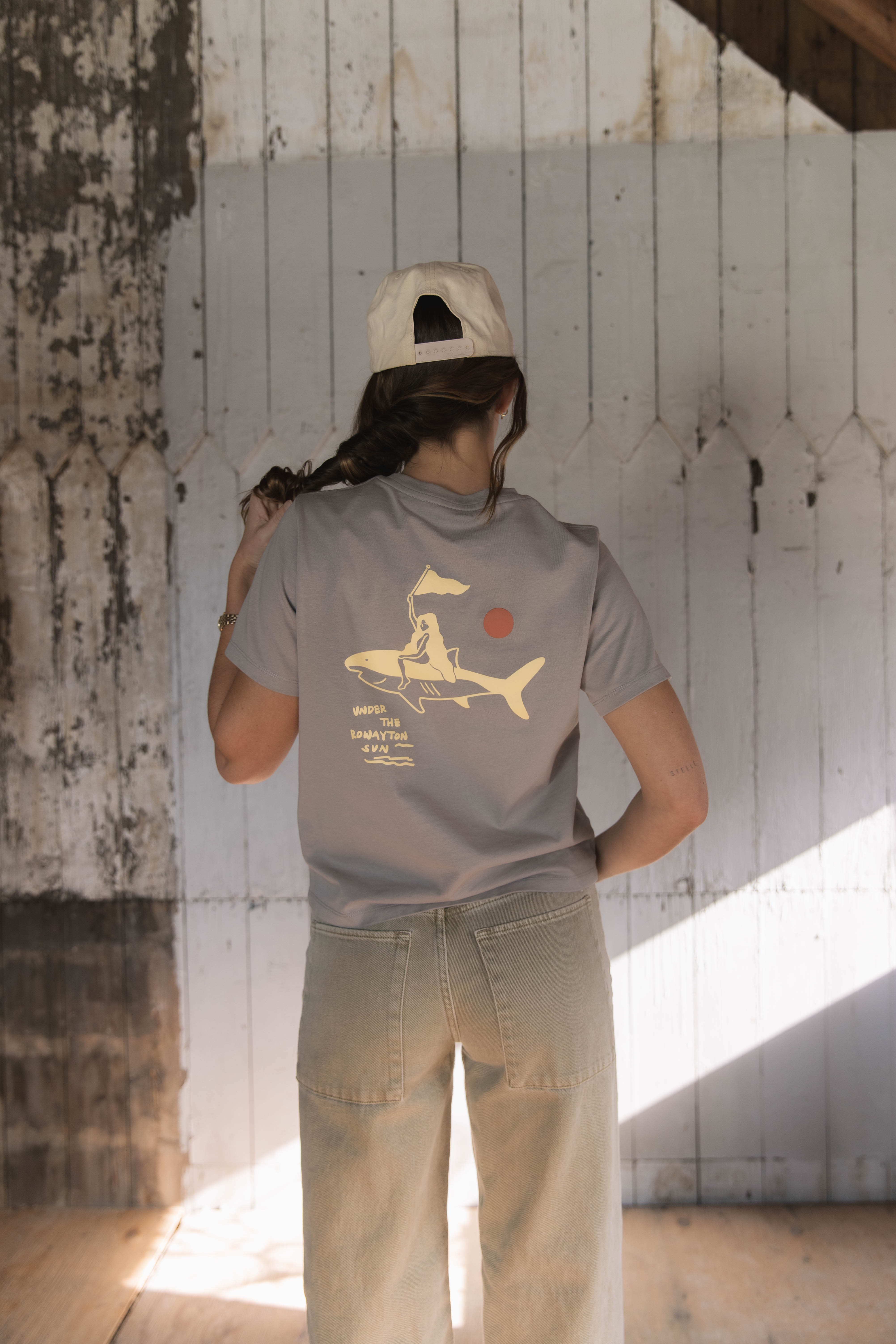 Inspired by surf culture, our Pearl Bay Tee brings a little Rowayton magic to your everyday rotation. The front keeps it clean with our classic Pearl logo, while the back makes a statement — Pearl riding a shark under the Rowayton sun, a playful nod to our coastal roots. Crafted in a soft stone-gray cotton with a relaxed fit, it’s the perfect tee for beach days, boat days, or any day you want to bring a bit of the bay with you.