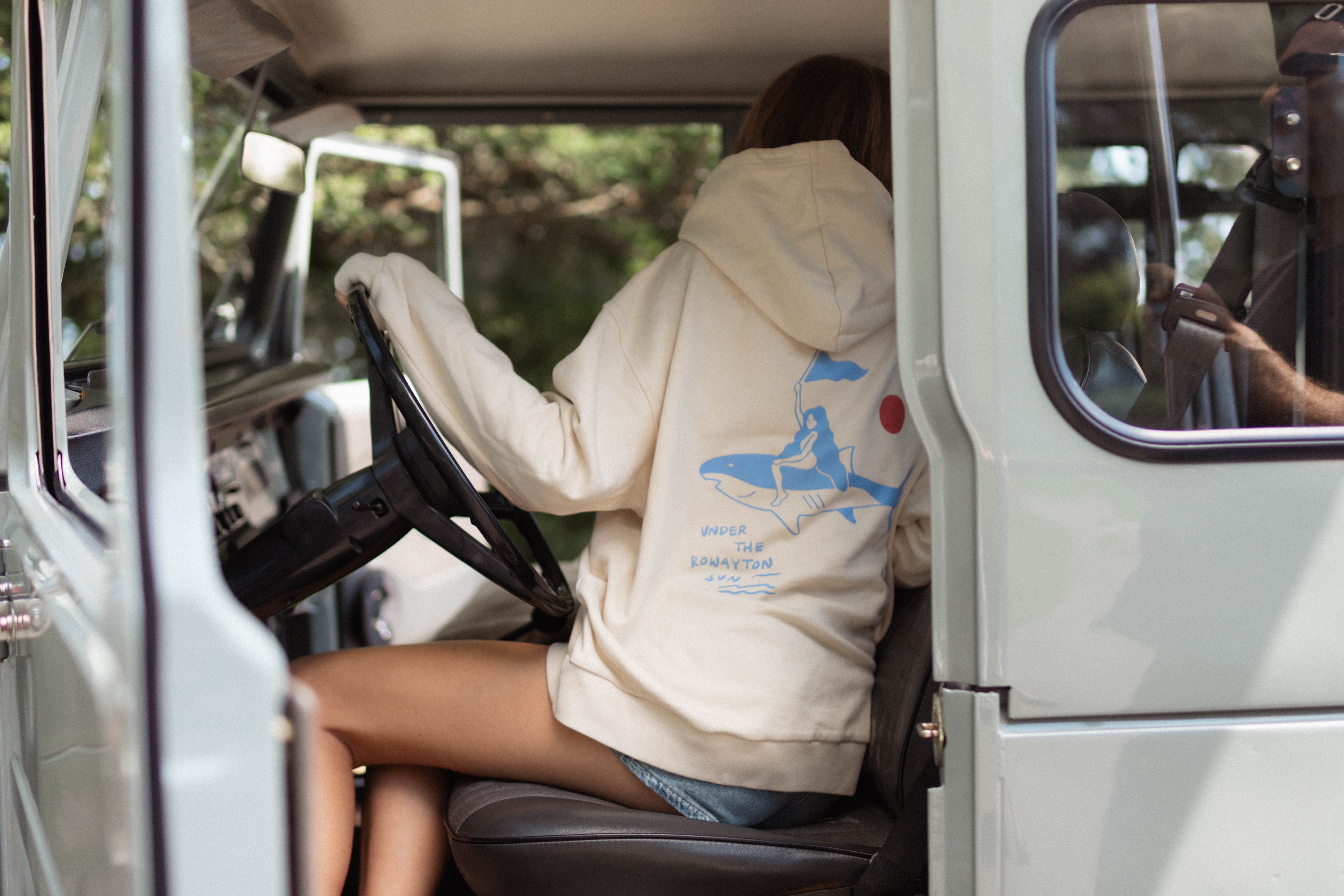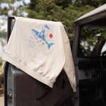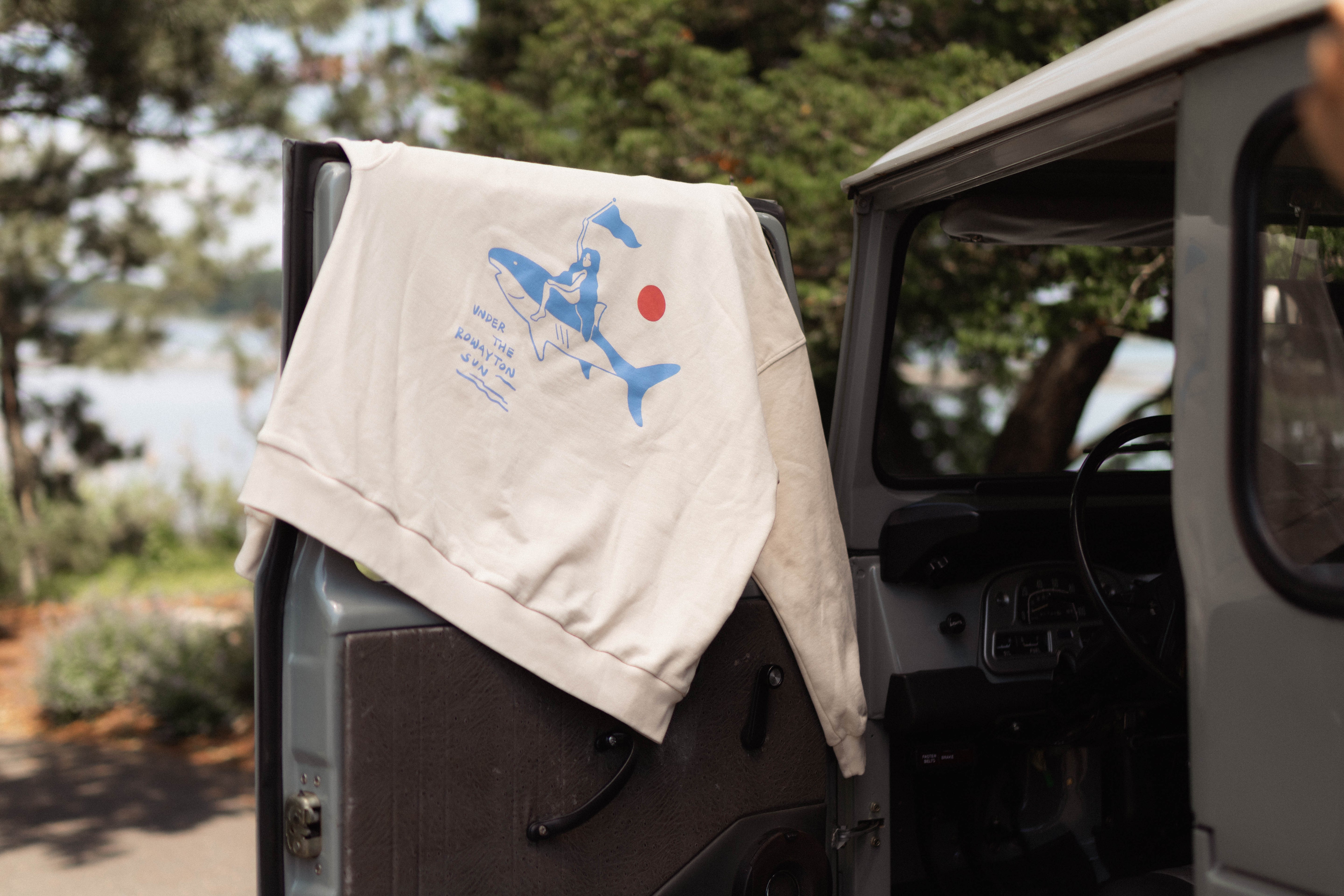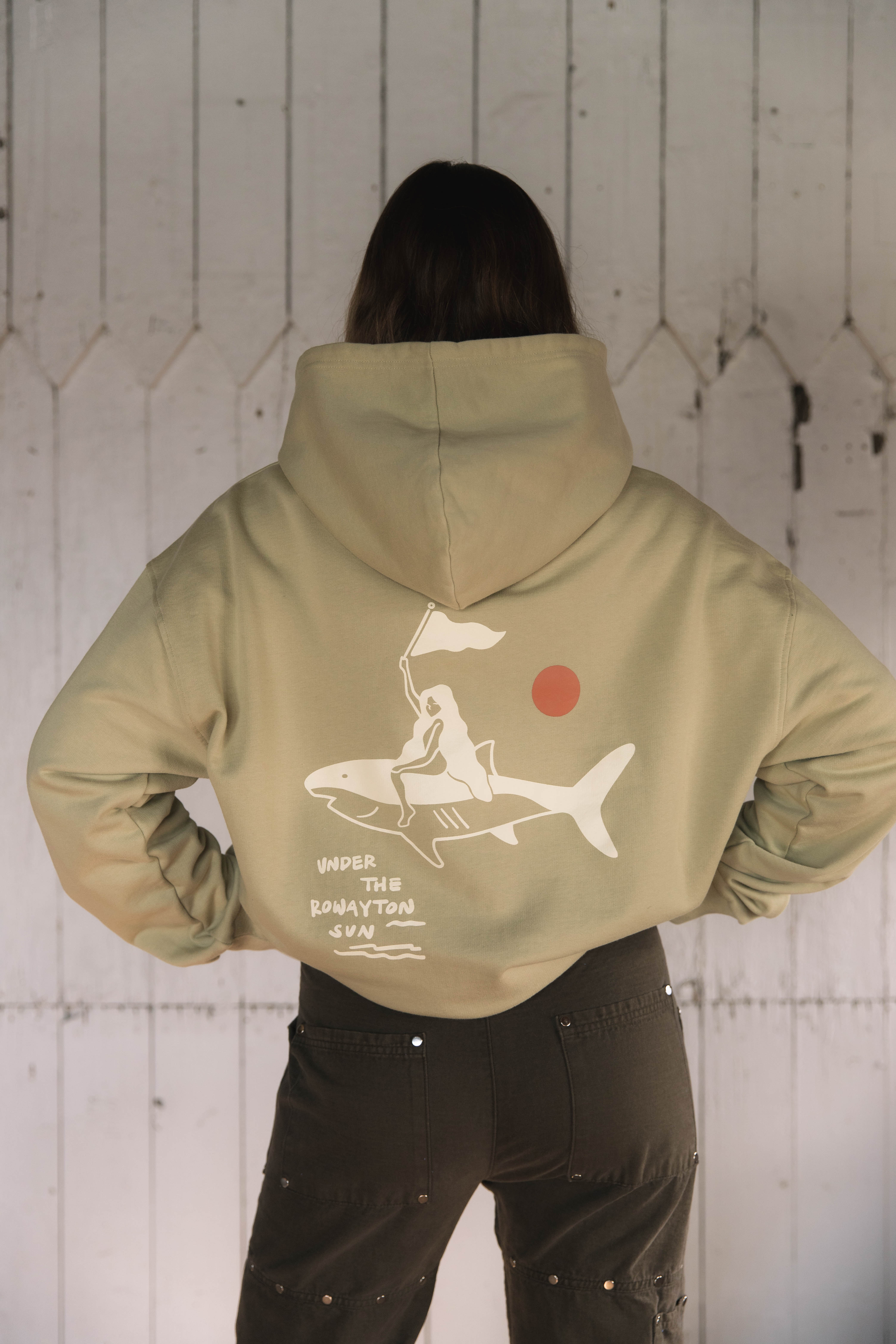 An ode to Pearl herself—salty, carefree, and full of character. This cozy hoodie features her classic logo on the front chest, with a playful back graphic of Pearl riding a mako shark, framed by the phrase “Under the Rowayton Sun.” Made for golden hours, dock days, and anyone who carries a little bit of her spirit.