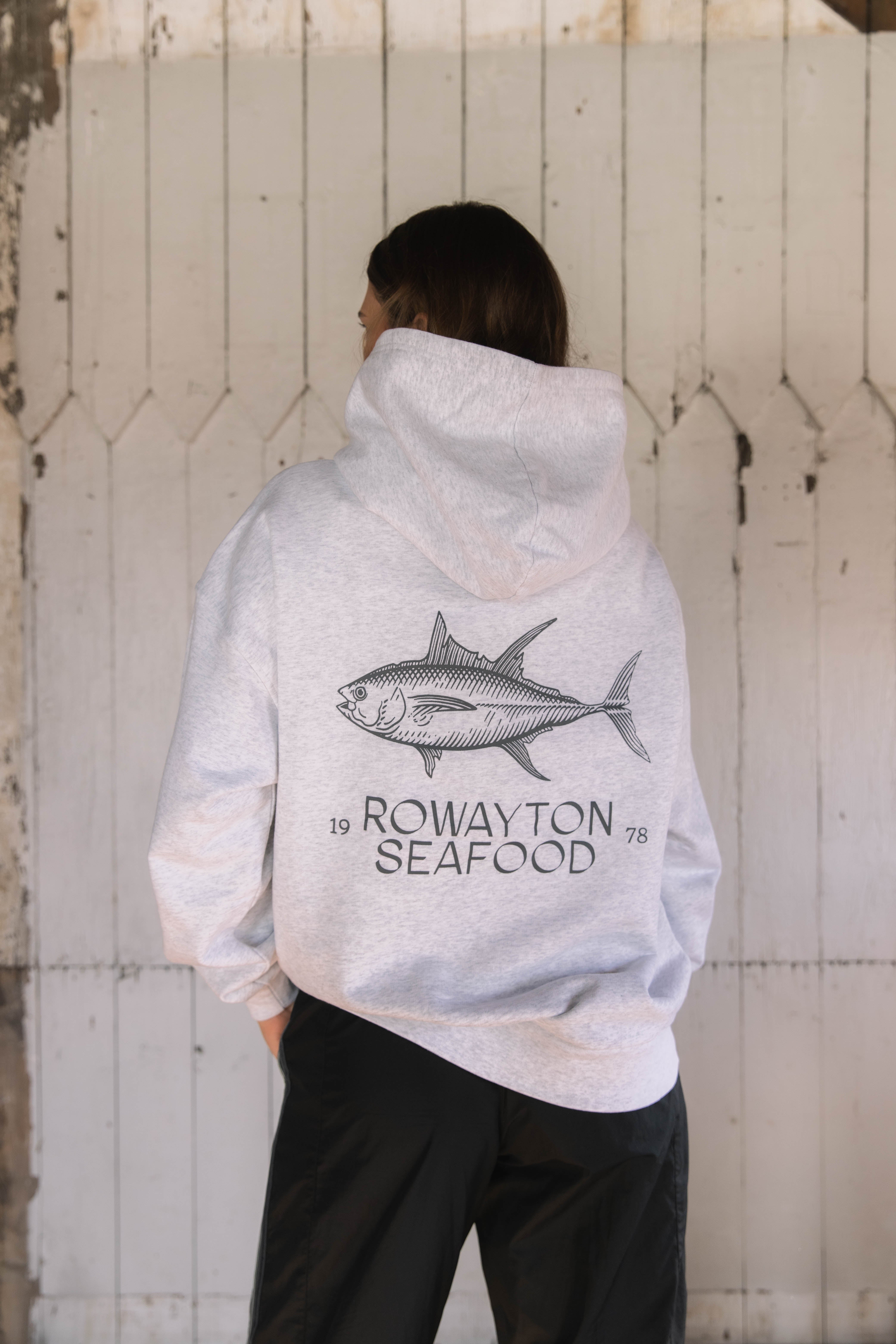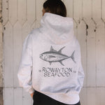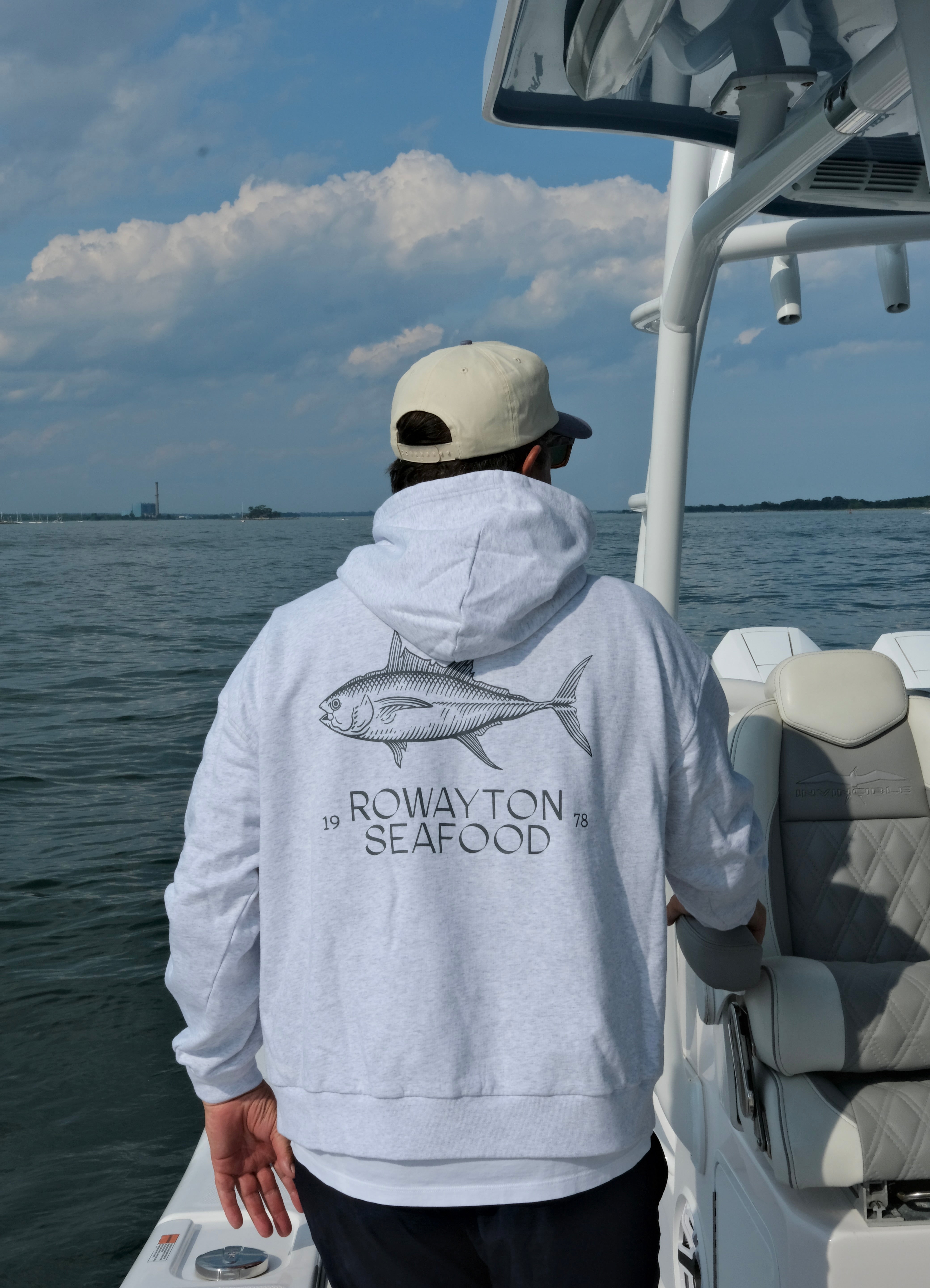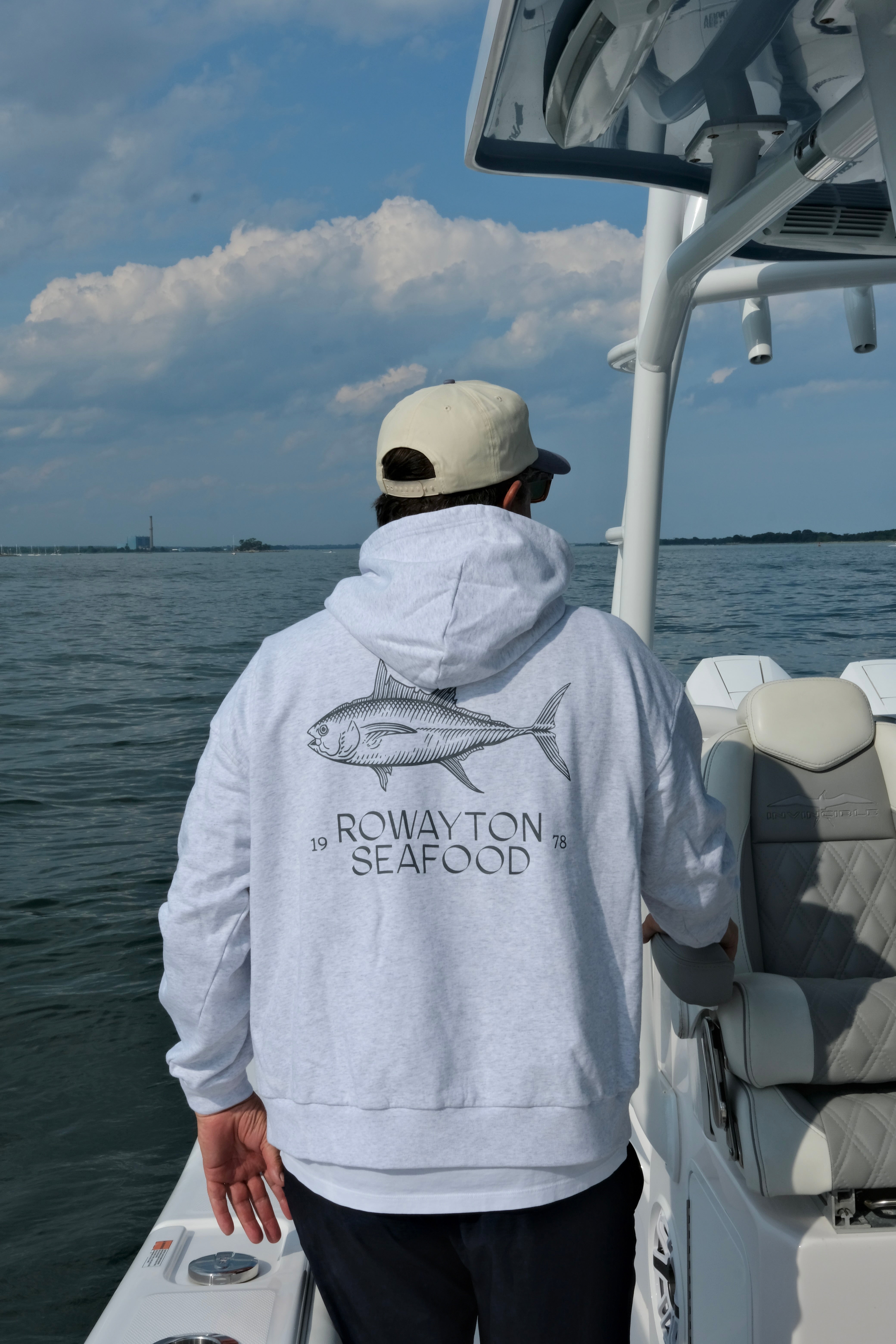 Your new go-to layer for early dock calls and late-night bites. This heather grey hoodie features a small RS flag on the front chest—our subtle nod to hometown pride—and our full Rowayton Seafood logo on the back, anchored by our signature big tuna. Soft, durable, and made for wherever the tide takes you.