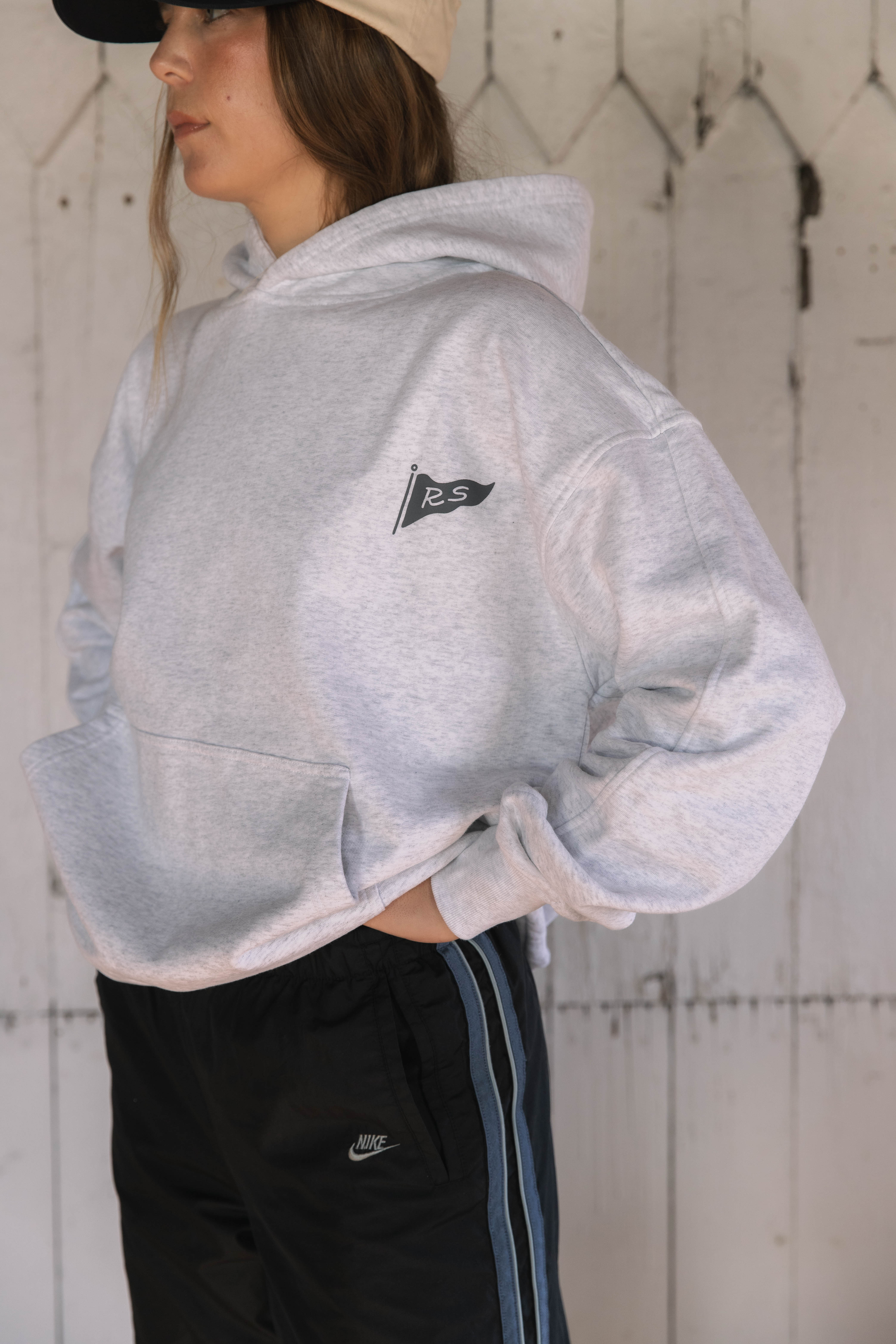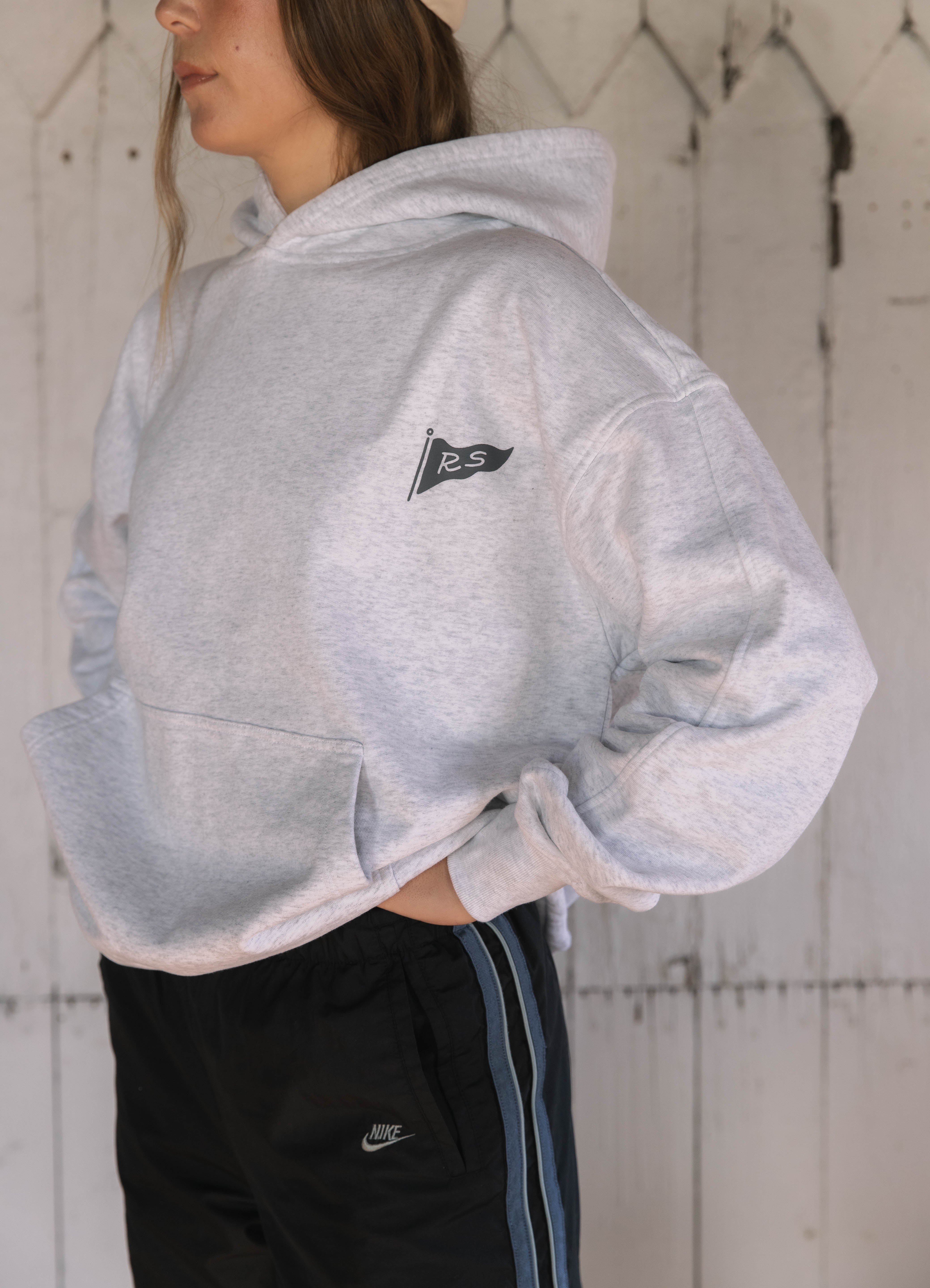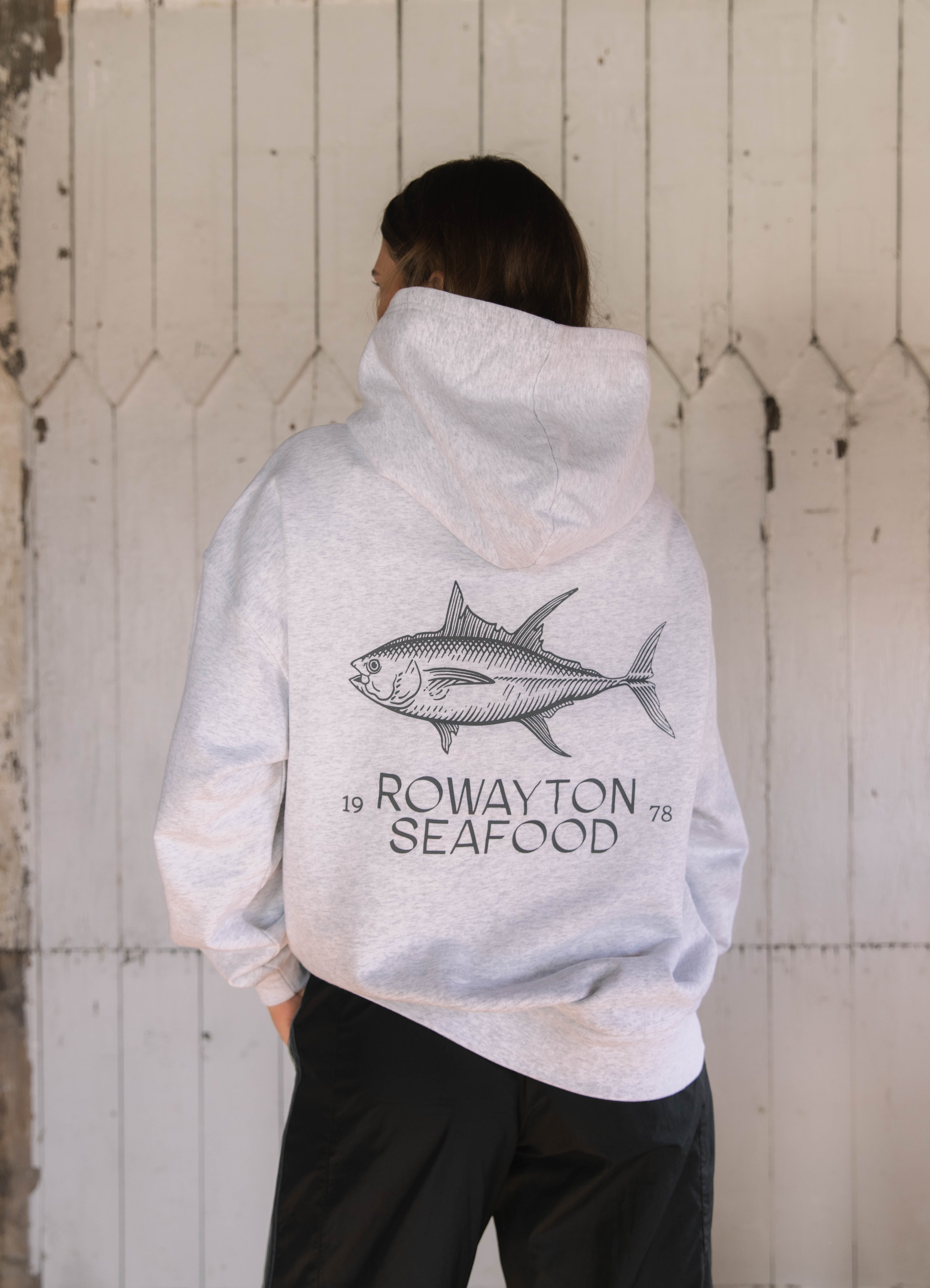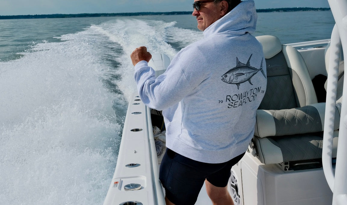 Your new go-to layer for early dock calls and late-night bites. This heather grey hoodie features a small RS flag on the front chest—our subtle nod to hometown pride—and our full Rowayton Seafood logo on the back, anchored by our signature big tuna. Soft, durable, and made for wherever the tide takes you.